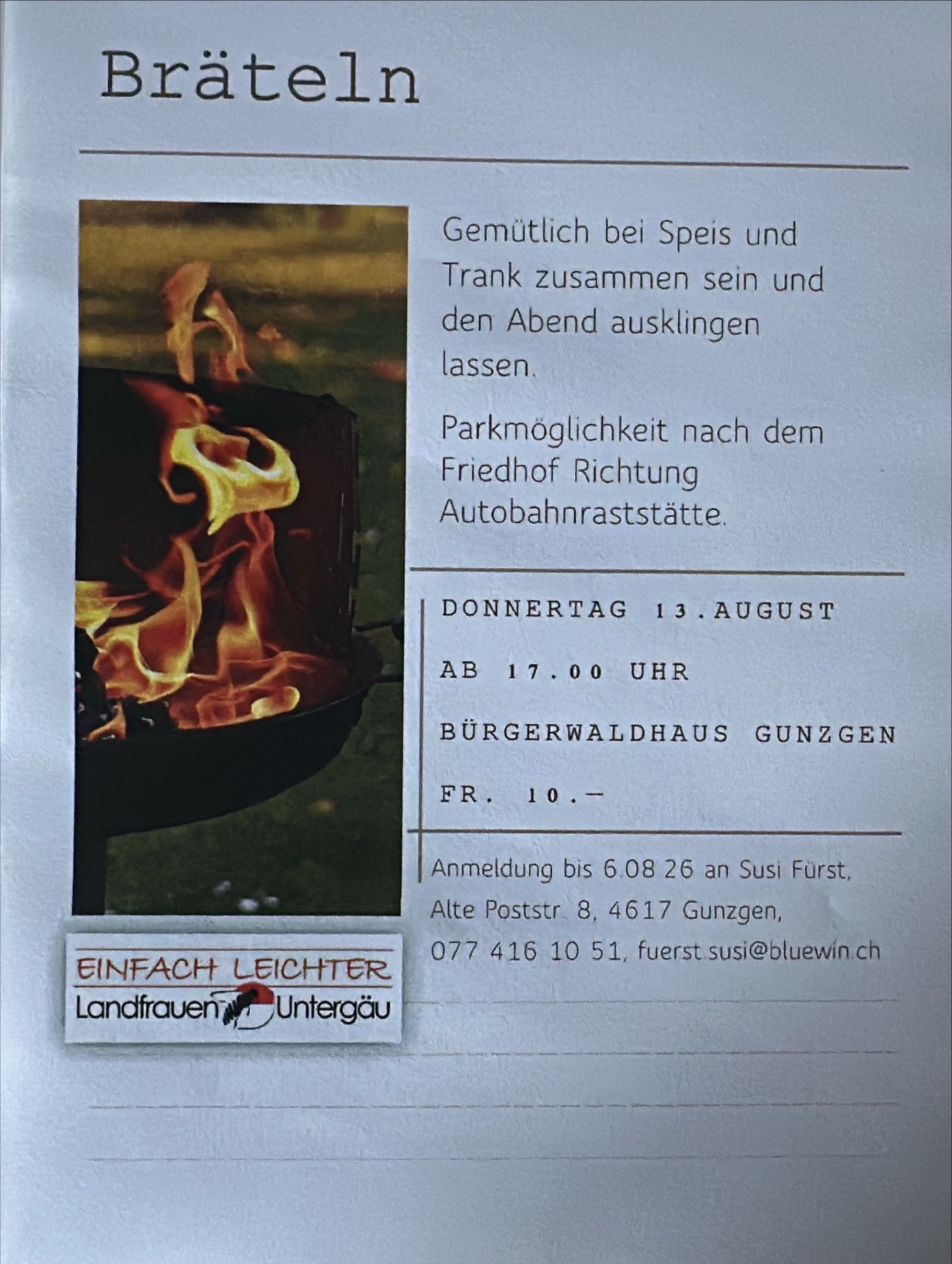 Geniesse einen gemütlichen Sommeranlass beim Bräteln im Bürgerwaldhaus in Gunzgen. In entspannter Atmosphäre, mit feinem Speis und Trank, bleibt Zeit für gute Gespräche, Lachen und gemeinsames Zusammensein. Ein Abend zum Abschalten und Geniessen.