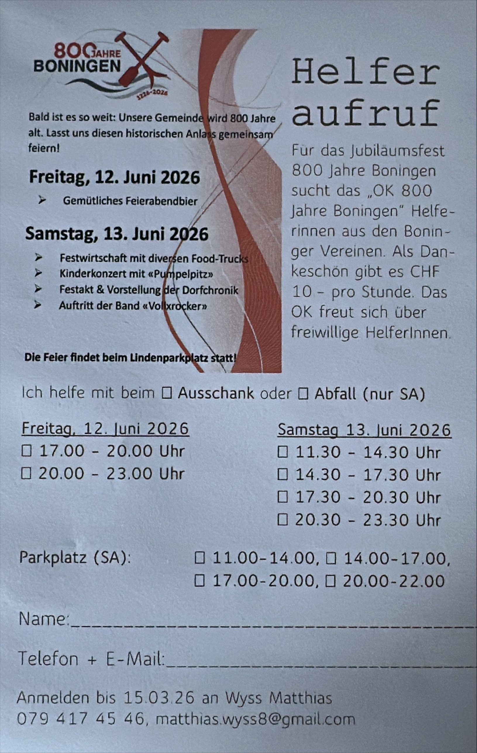 Gemeinsam für 800 Jahre BoningenFür die 800 Jahrfeier sucht das OK "800 Jahre Boningen" motivierte Helfer:innen aus den Boninger Vereinen. Hast du Lust mitanzupacken, Teil eines besonderen Anlasses zu sein und Dorfgemeinschaft zu erleben? Dann mach mit – Boningen zählt auf dich!